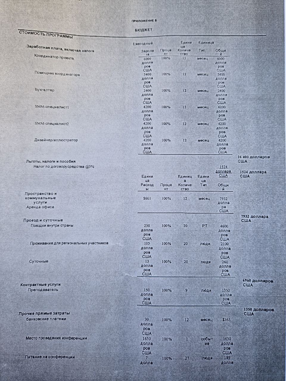 Что касается финансовой части, то, согласно указанному документу, зарплата координатора проекта в период активности составила $6 тысяч в месяц. Помощника координатора — $5,4 тысячи в месяц. Далее бухгалтер — $2,4 тысячи, SMM-специалист $4,2 тысячи, дизайнер-иллюстратор — $4,2 тысячи.